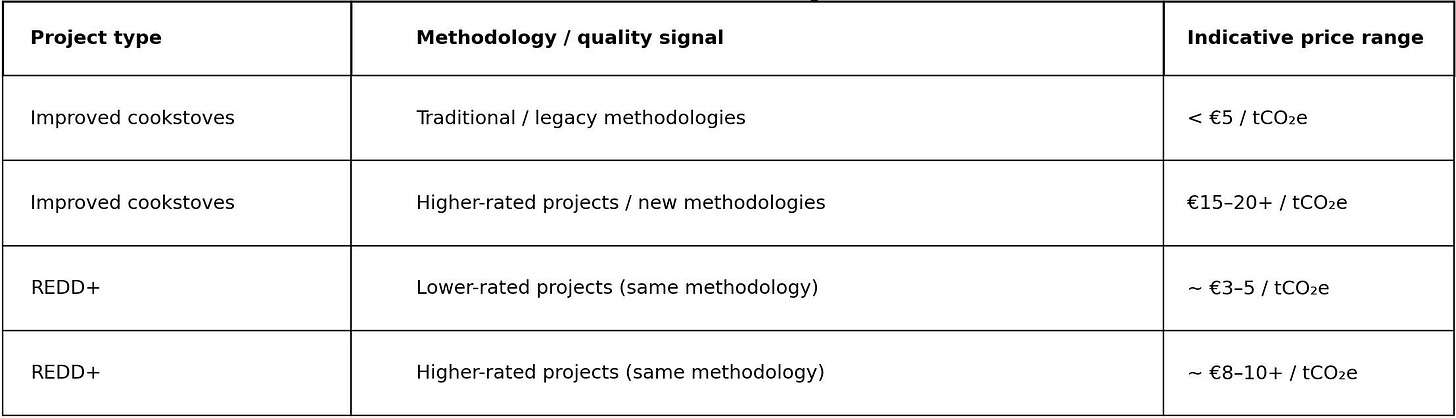 This dynamic becomes particularly visible in price formation. Across several segments, large price gaps have emerged between credits perceived as higher-integrity and those seen as lower-integrity sometimes even when projects rely on similar or identical methodologies.